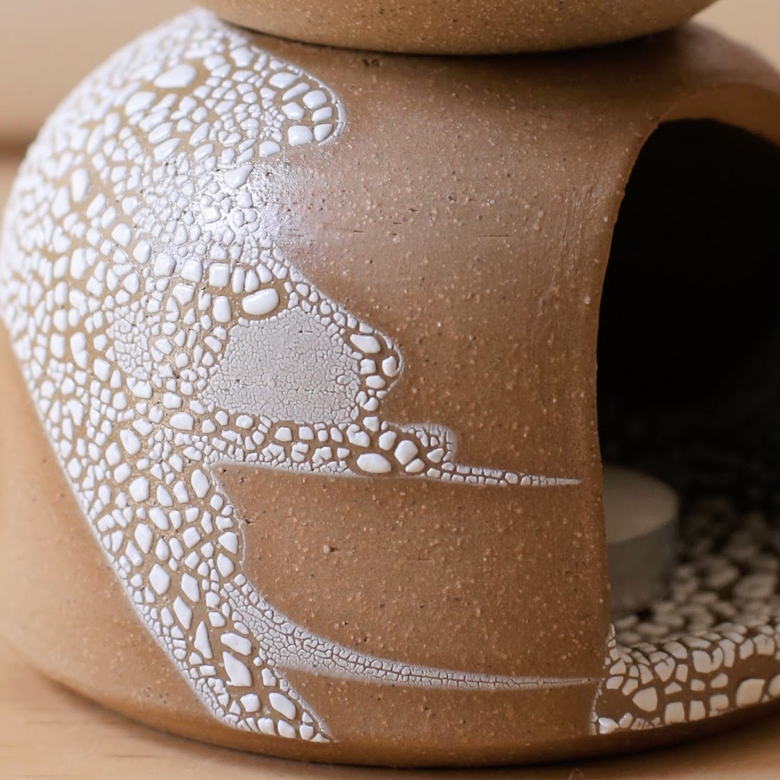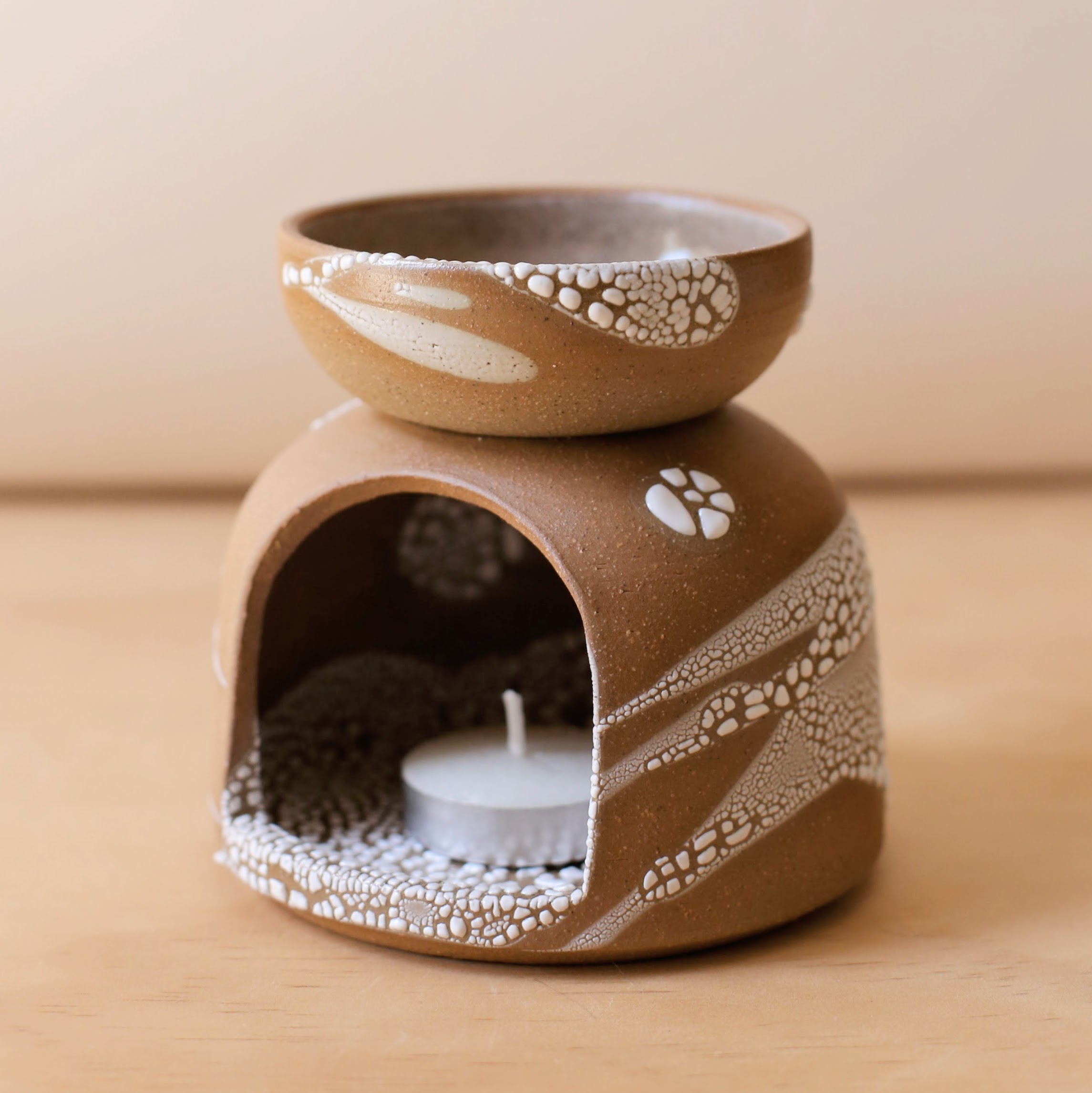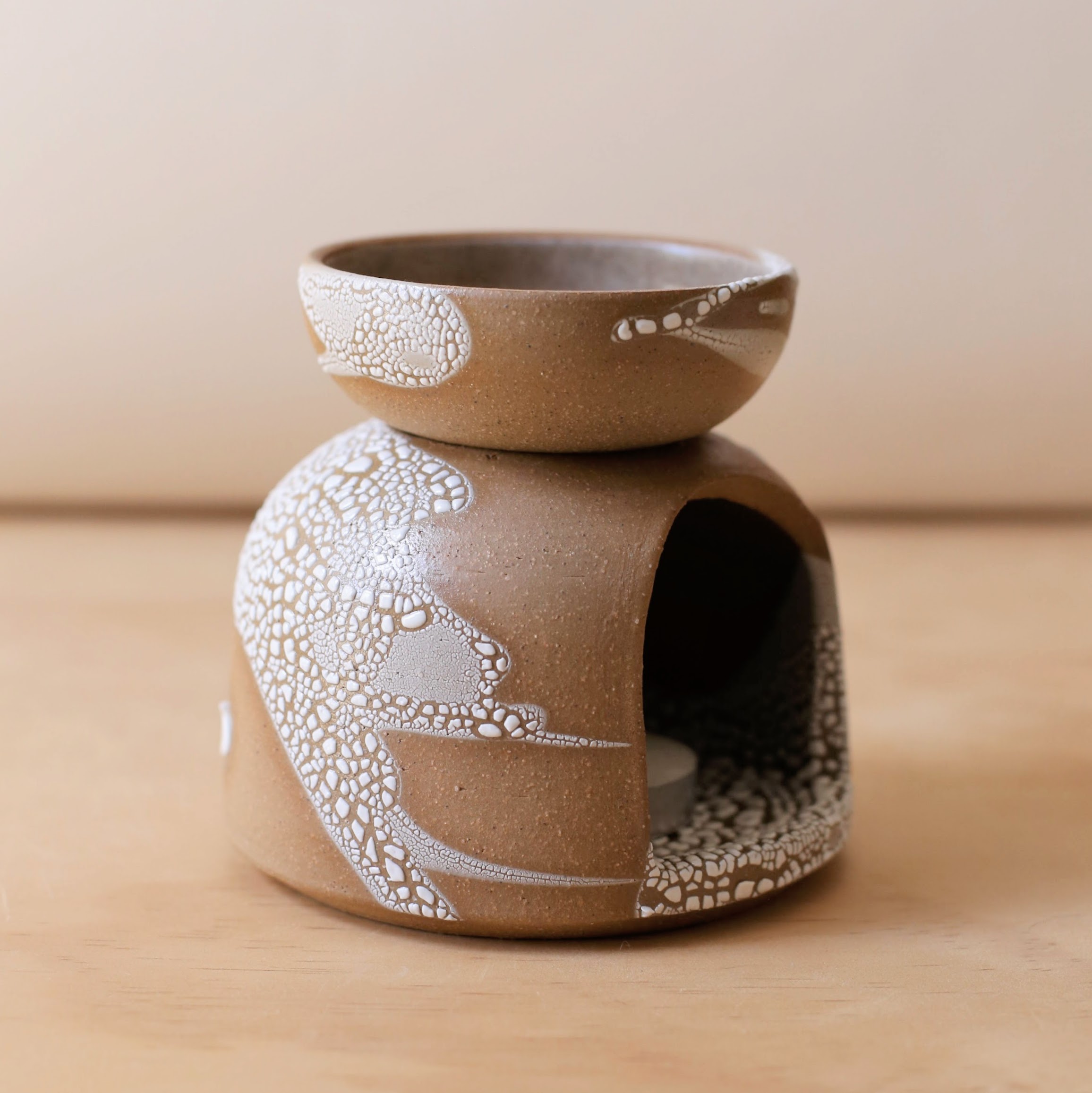 This oil burner is a beautiful earthy neutral, made from a warm brown clay. It has splashes of a bobbly white glaze that for some reason feels uniquely Australian to me. Other parts of the burner are left unglazed so that you can enjoy the loveliness of this beautiful clay.