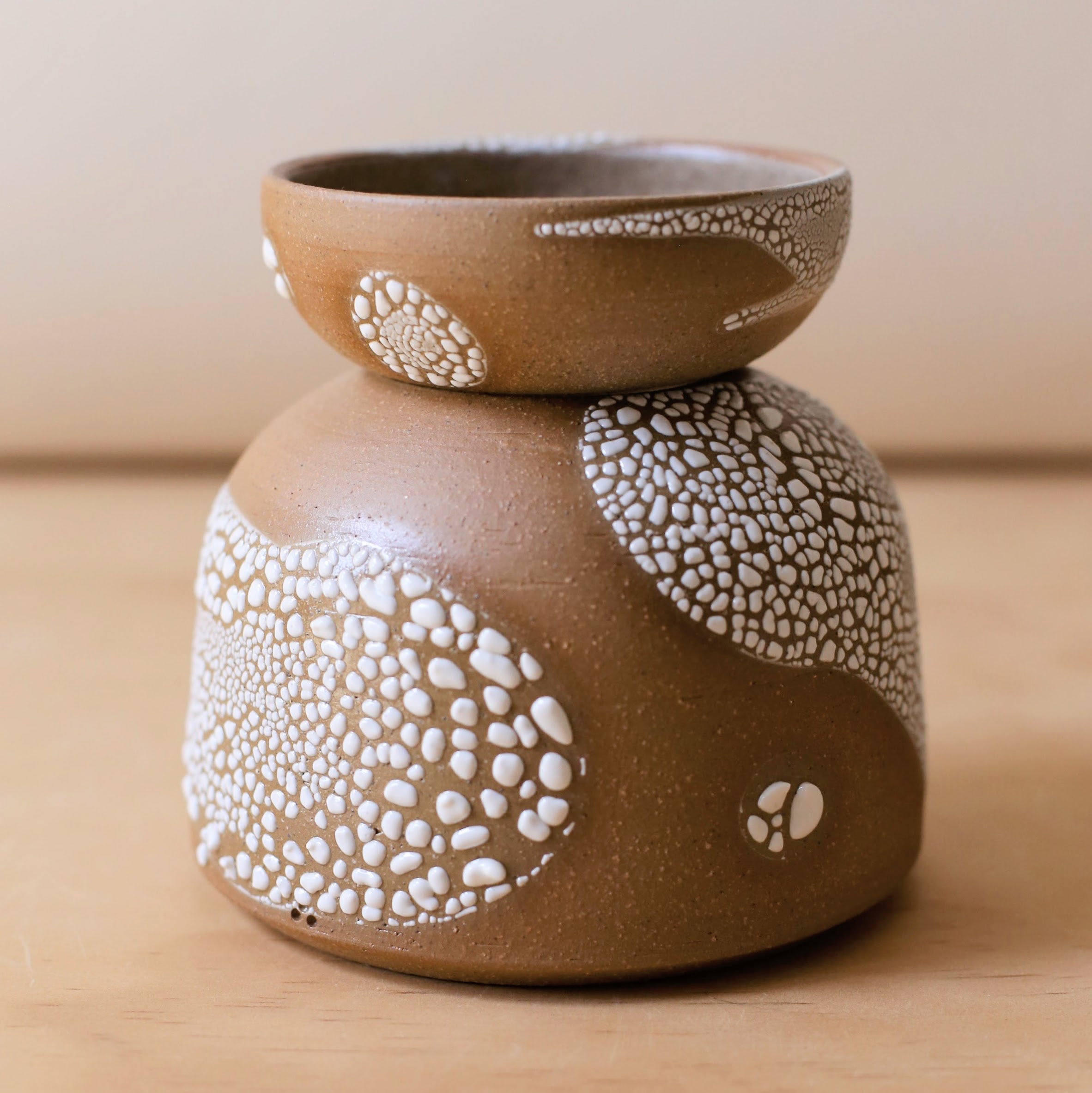 I’ve made the burner in two parts so that you can easily remove the bowl to refill or clean it. The bowl is glazed on the inside in a clear glaze.