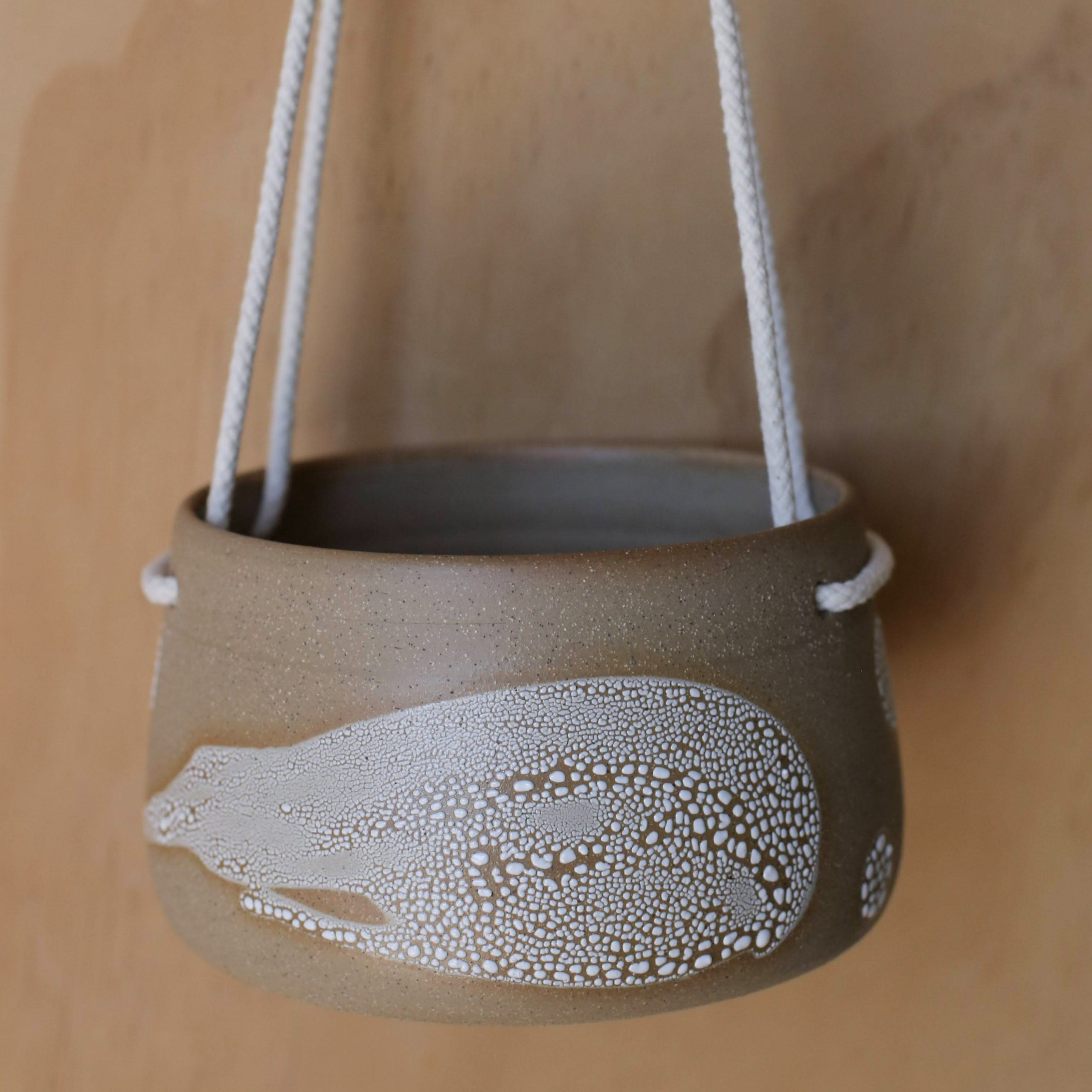 This is a beautiful handmade ceramic hanging planter, which I made on a pottery wheel in my backyard in Geelong, Australia. The glaze is handcrafted by me too.